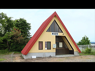 1面1線の単式ホームの駅で、駅舎は赤い屋根が地面まで延びていて、正面から見ると三角形に見える。