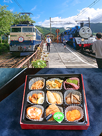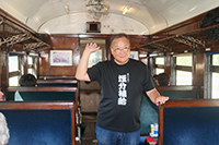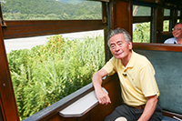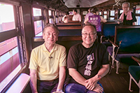 取材当日は、すでに夏休みに入っていて、真夏の強い日差しで気温がグングン上昇する中「きかんしゃトーマス」号に乗るため大勢の家族連れで新金谷駅は大変な賑わいでした。私が乗車したのはトーマス号ではなく夏季限定の「ビール列車・昼のみコース」(夕方からの納涼コースもあります)旧型客車3両の内2両がビール列車になっていて鳥塚社自ら乗客のアテンドをされていました。製造から70年経った旧型客車オハ35の車内に入り指定された席に座った瞬間、遥か昔の記憶が蘇ってきました。古い客車ですから勿論冷房装置はありません。しかし天井に設置された扇風機(JNRのロゴが残ったまま)と全開した窓から流れ込む涼風は冷えたビールと最高の組合せでした!!(ビールは飲み放題・豪華なおつまみ弁当も付いていました!!)