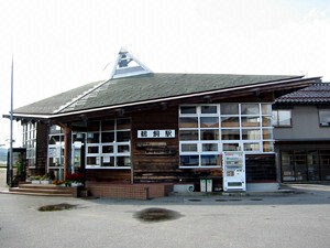 駅舎は、昭和63年に見附島を模して建て替えられた。見附島は、駅から徒歩15分のところにあり、軍艦に似ていることから軍艦島と呼ばれる高さ28mの岩。