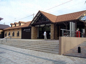 フルーツの町らしく、ホームには「果実の郷」と書かれた台の上に桃とぶどうのオブジェが飾られている。