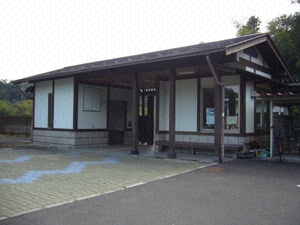 山城をイメージして造られた駅舎。石垣の土台の上にシンプルな建物が建てられている。駅から徒歩10分のところにふじつ温泉があり、庭園風の岩風呂で旅の疲れを癒してくれる。
